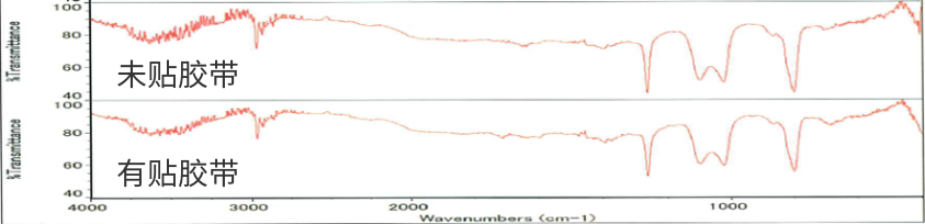 分析比較未貼膠帶的基板表面和有貼膠帶的基材表面的溶劑提取物, 并無差異。