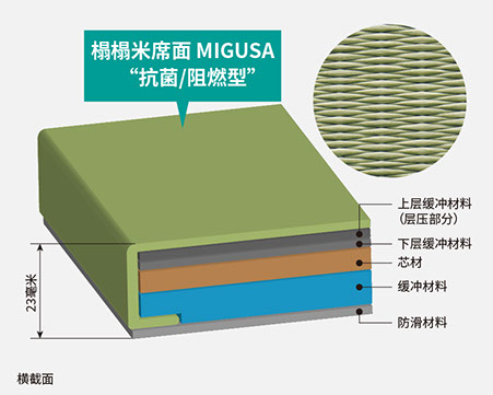 在榻榻米席面MIGUSA的樹脂材料(聚丙烯)上,賦予了抑制細(xì)菌增殖的抗菌成分和預(yù)防火災(zāi)的防火性能,是一種抗菌、防火榻榻米。